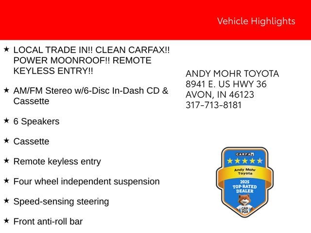 Andy Mohr Toyota, at 8941 E. Highway 36 in Avon, is one of the largest Toyota Certified dealers in the Midwest. We price our cars to sell quickly, and travel the country to provide you a wide range of vehicles. Call us at 317.713.8181 or visit our website at www.andymohrtoyota.com. You consent to receive autodialed, pre-recorded and artificial voice telemarketing and sales calls, text messages and/or emails from or on behalf of Andy Mohr at the phone number and/or email provided in this application, including cell phone numbers. You understand that this consent is not a condition of purchase of a vehicle or any services from Andy Mohr.