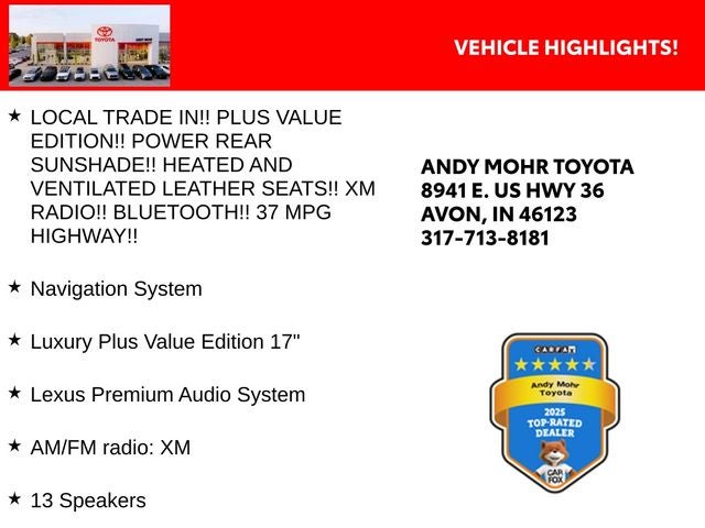 - LOCAL TRADE IN!! PLUS VALUE EDITION!! POWER REAR SUNSHADE!! HEATED AND VENTILATED LEATHER SEATS!! XM RADIO!! Bluetooth®!! 37 MPG HIGHWAY!!