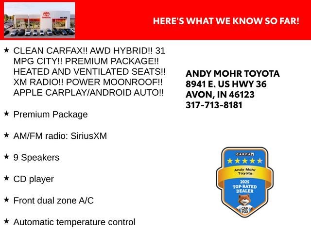 - CLEAN CARFAX!! AWD HYBRID!! 31 MPG CITY!! PREMIUM PACKAGE!! HEATED AND VENTILATED SEATS!! XM RADIO!! POWER MOONROOF!! APPLE CARPLAY/ANDROID AUTO!!