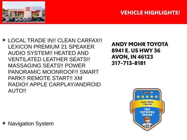 - LOCAL TRADE IN!! CLEAN CARFAX!! LEXICON PREMIUM 21 SPEAKER AUDIO SYSTEM!! HEATED AND VENTILATED LEATHER SEATS!! MASSAGING SEATS!! POWER PANORAMIC MOONROOF!! SMART PARK!! REMOTE START!! XM RADIO!! APPLE CARPLAY/ANDROID AUTO!!