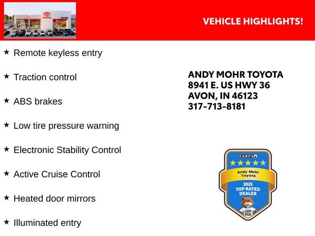 Andy Mohr Toyota, at 8941 E. Highway 36 in Avon, is one of the largest Toyota Certified dealers in the Midwest. We price our cars to sell quickly, and travel the country to provide you a wide range of vehicles. Call us at 317.713.8181 or visit our website at www.andymohrtoyota.com. You consent to receive autodialed, pre-recorded and artificial voice telemarketing and sales calls, text messages and/or emails from or on behalf of Andy Mohr at the phone number and/or email provided in this application, including cell phone numbers. You understand that this consent is not a condition of purchase of a vehicle or any services from Andy Mohr.