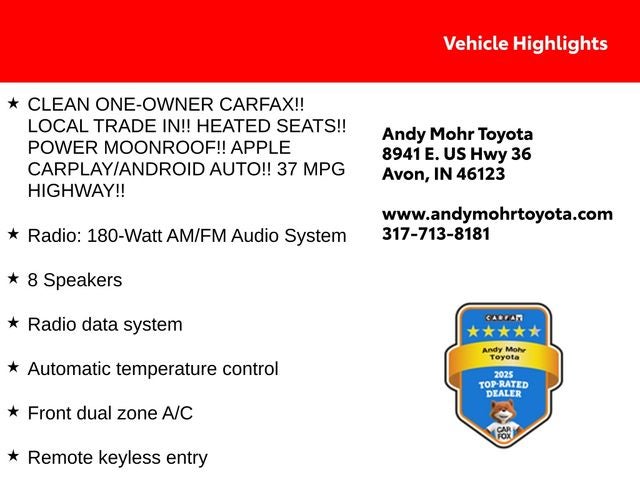 - CLEAN ONE-OWNER CARFAX!! LOCAL TRADE IN!! HEATED SEATS!! POWER MOONROOF!! APPLE CARPLAY/ANDROID AUTO!! 37 MPG HIGHWAY!!